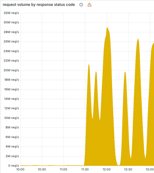 因此从11:30到13:30,请求报错量呈现出“过山车”式的波动——时而激增、时而骤减,甚至短暂完全消失后又再次拉满。这种异常现象使得Cloudflare工程师在前两个小时内,始终将事故判定为黑客组织发起的DDoS攻击。
