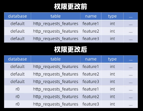 因此在权限补丁发布后,用户同时拥有了Default和R0数据库的元数据读取权限,上述SQL语句便会同时返回两个数据库的system.columns数据。