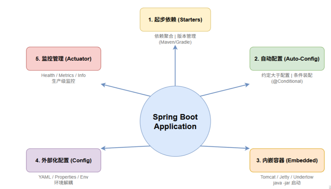 - 自动配置:这是 Spring Boot 最核心的特性。它会根据你引入了什么依赖,自动帮你配置好 Bean。底层是基于