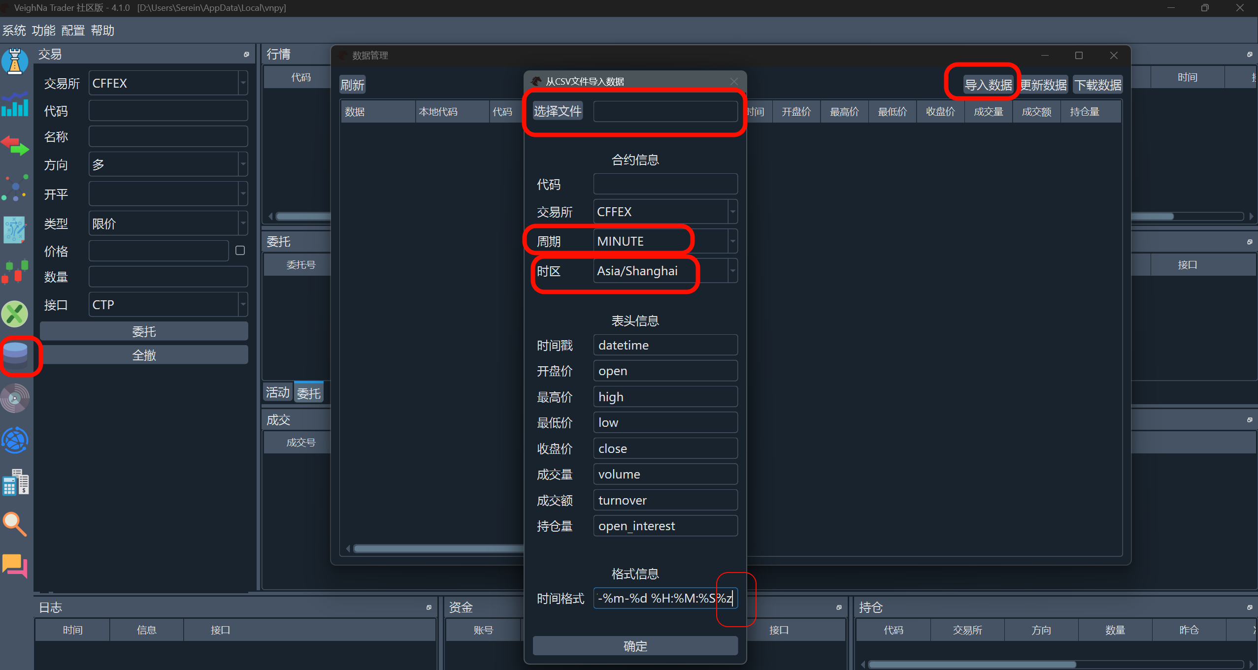 选择csv格式的文件,包含表头,j交易所随便选一个